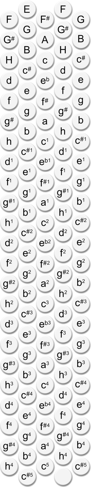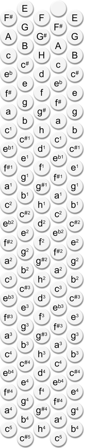 - B‑Griff: Die innerste Grundreihe beginnt mit dem Ton C, die Halbtonschritte steigen von innen nach außen. Es ist vor allem in Russland, Norwegen, Serbien und Belgien üblich.